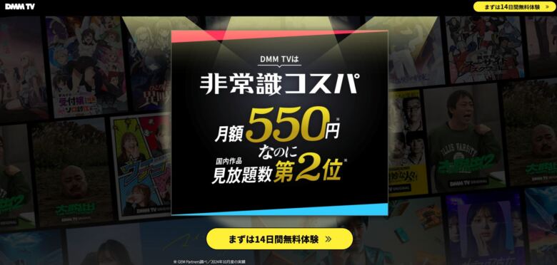 2 | DMM TV | 550円 | 19万作以上 | 14日間 | 4K | スマートフォン・タブレット、Amazon Fire TV、パソコン、テレビ、PlayStation®5/PlayStation®4 |