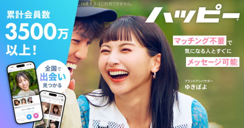 ハッピーメールは1995年設立、会員数3,500万人を超える国内最大級の出会い系サービスです。年齢確認・本人確認が必須で、斎藤さんと比べ業者リスクは下がっています。